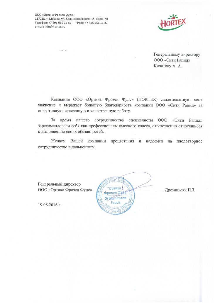 Компания ООО "Ортика Фрозен Фудс" (HORTEX) свидетельствует свое уважение и выражает большую благодарность компании ООО "Сити Рапид" за оперативную, слаженную и качественную работу.