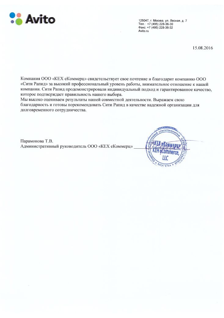 Компания ООО "КЕХ еКоммерц" свидетельствует свое почтение и благодарит компанию ООО "Сити Рапид" за высокий профессиональный уровень работы, внимательное отношение к нашей компании.