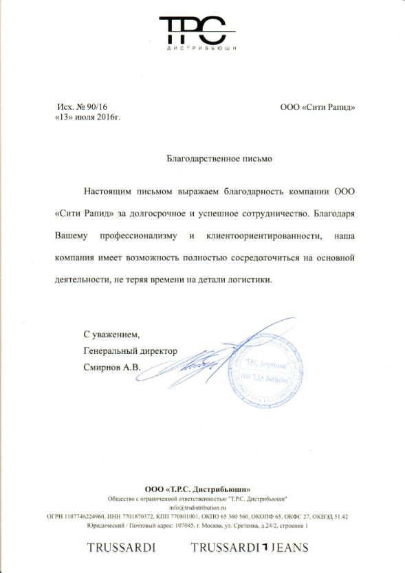 Настоящим письмом выражаем благодарность компании ООО "Сити Рапид" за долгосрочное и успешное сотрудничество.
