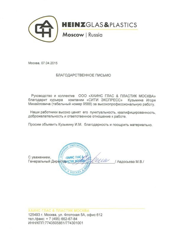 Благодарим компанию Сити Экспресс за плодотворное и беспроблемное сотрудничество уже на протяжении трех лет. Всегда получаем от менеджеров быструю обратную связь по всем вопросам относительно наших заказов. Отдельно хочется отметить высокое внимание ко всем пожеланиям со стороны клиента. Нам очень приятно видеть ответственных и добросовестных исполнителей.