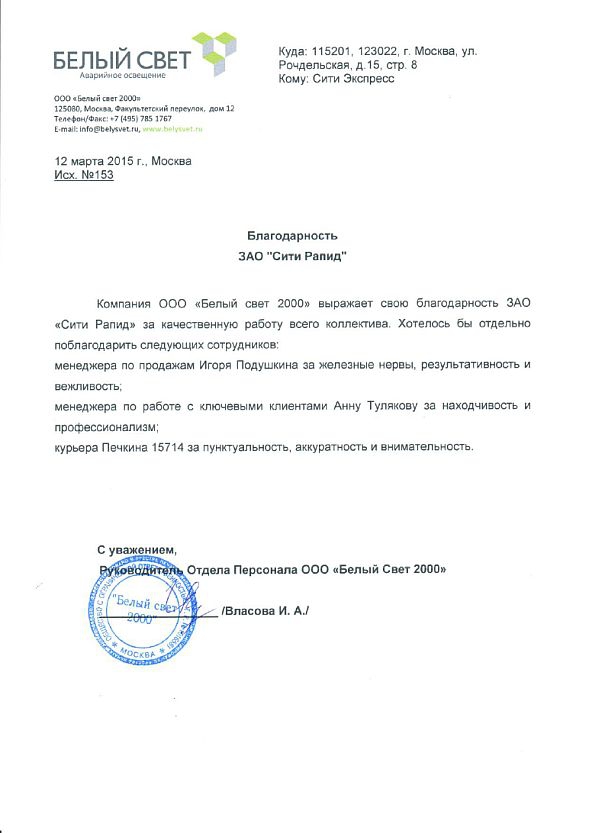 От лица сотрудников нашей компании, регулярно пользующихся курьерскими услугами компании City Express, прошу объявить благодарность курьеру Надежде Вельможко за ее отличную работу, за ответственность, обязательность, безупречную вежливость и энтузиазм. Работать с Надей легко и приятно.
