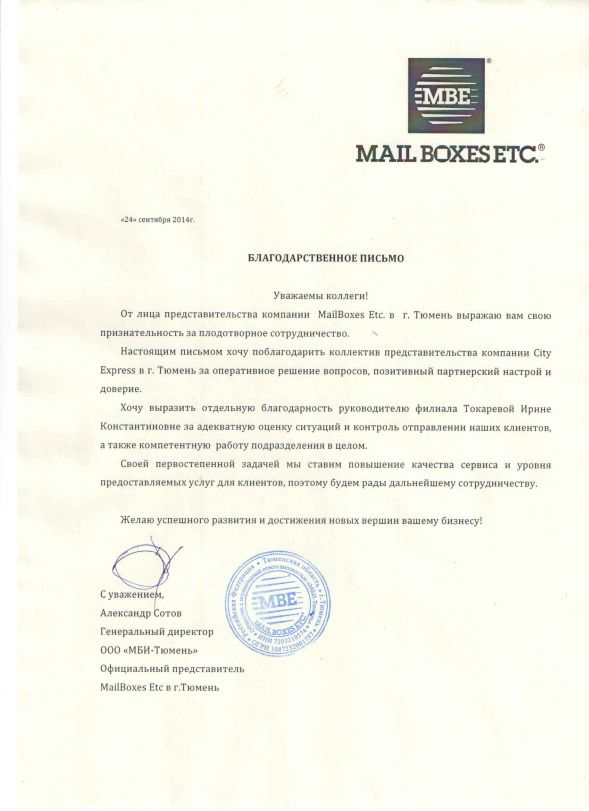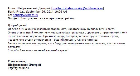 Быстро, вовремя, аккуратно. Передаю через Сити Экспресс документы, всегда все проходит без проблем. По срочному тарифу из Москвы в Новосибирск доставили за 1 день. Хочу выразить благодарность за высокое качество услуг, ответственность и соблюдение сроков.