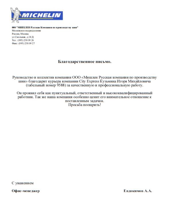 Сотрудничаем с компанией City Express второй год на постоянной основе. Передаем служебную документацию и грузы. Работа полностью налажена, сроки соблюдаются, все передается без повреждений и потерь. Также нам подобрали хороший по стоимости тариф для юрлиц. Будем рады продолжить сотрудничество.