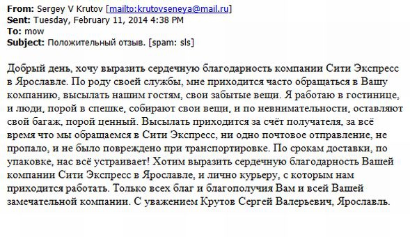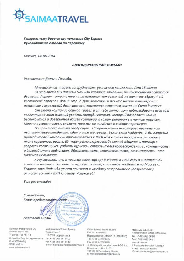 Быстро, вовремя, аккуратно. Передаю через Сити Экспресс документы, всегда все проходит без проблем. По срочному тарифу из Москвы в Новосибирск доставили за 1 день. Хочу выразить благодарность за высокое качество услуг, ответственность и соблюдение сроков.