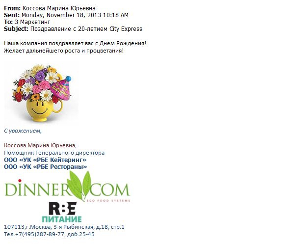 Поздравление от ООО «УК «РБЕ Кейтеринг»