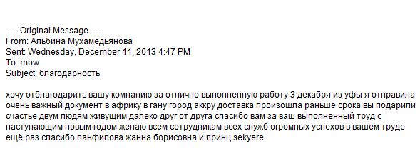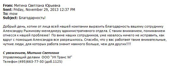 Быстро, вовремя, аккуратно. Передаю через Сити Экспресс документы, всегда все проходит без проблем. По срочному тарифу из Москвы в Новосибирск доставили за 1 день. Хочу выразить благодарность за высокое качество услуг, ответственность и соблюдение сроков.