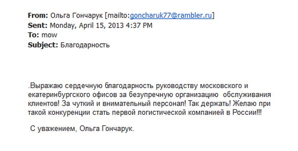 Выражаю сердечную благодарность руководству московского и екатеринбургского офисов за безупречную организацию обслуживания клиентов! За чуткий и внимательный персонал! Так держать! Желаю при такой конкуренции стать первой логистической компанией в России!