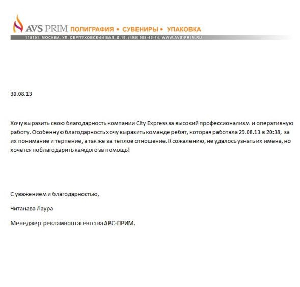 Благодарим компанию Сити Экспресс за плодотворное и беспроблемное сотрудничество уже на протяжении трех лет. Всегда получаем от менеджеров быструю обратную связь по всем вопросам относительно наших заказов. Отдельно хочется отметить высокое внимание ко всем пожеланиям со стороны клиента. Нам очень приятно видеть ответственных и добросовестных исполнителей.