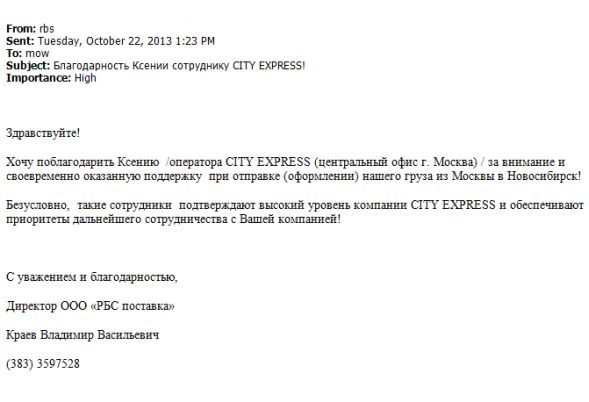 Быстро, вовремя, аккуратно. Передаю через Сити Экспресс документы, всегда все проходит без проблем. По срочному тарифу из Москвы в Новосибирск доставили за 1 день. Хочу выразить благодарность за высокое качество услуг, ответственность и соблюдение сроков.