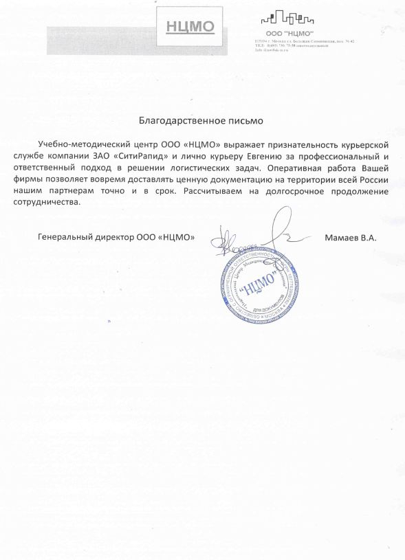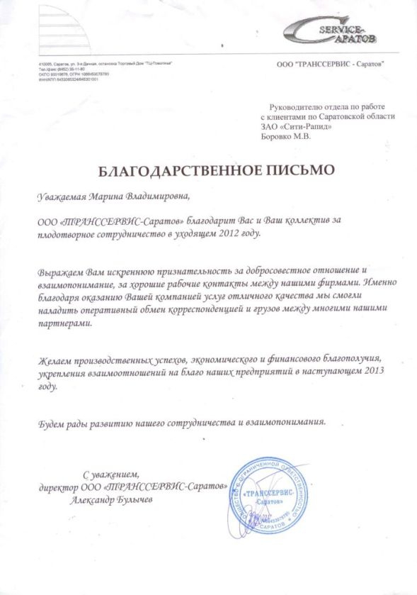 Быстро, вовремя, аккуратно. Передаю через Сити Экспресс документы, всегда все проходит без проблем. По срочному тарифу из Москвы в Новосибирск доставили за 1 день. Хочу выразить благодарность за высокое качество услуг, ответственность и соблюдение сроков.
