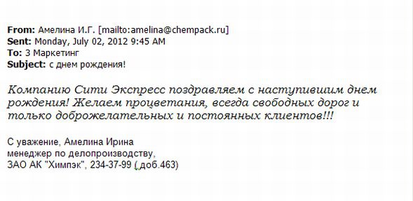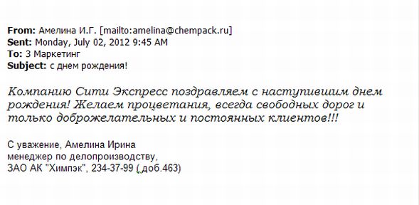 Быстро, вовремя, аккуратно. Передаю через Сити Экспресс документы, всегда все проходит без проблем. По срочному тарифу из Москвы в Новосибирск доставили за 1 день. Хочу выразить благодарность за высокое качество услуг, ответственность и соблюдение сроков.