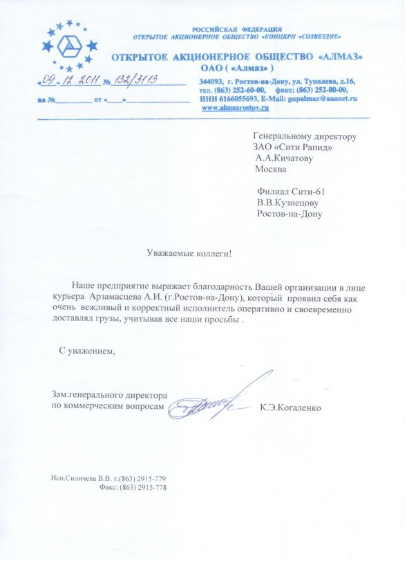 Быстро, вовремя, аккуратно. Передаю через Сити Экспресс документы, всегда все проходит без проблем. По срочному тарифу из Москвы в Новосибирск доставили за 1 день. Хочу выразить благодарность за высокое качество услуг, ответственность и соблюдение сроков.