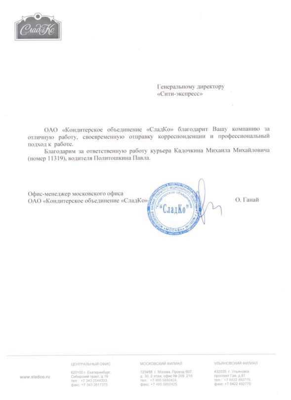 Благодарим компанию Сити Экспресс за плодотворное и беспроблемное сотрудничество уже на протяжении трех лет. Всегда получаем от менеджеров быструю обратную связь по всем вопросам относительно наших заказов. Отдельно хочется отметить высокое внимание ко всем пожеланиям со стороны клиента. Нам очень приятно видеть ответственных и добросовестных исполнителей.