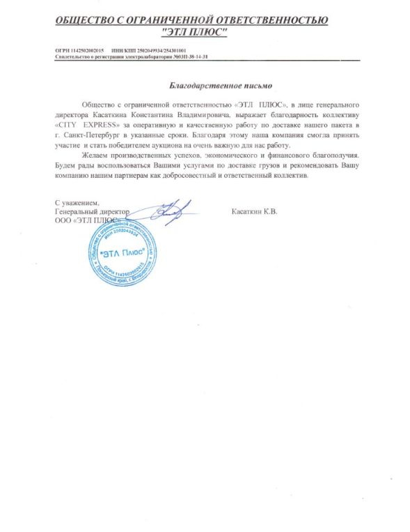 Общество с ограниченной ответственностью "ЭТЛ ПЛЮС", в лице генерального директора Касаткина Константина Владимировича, выражает благодарность коллективу City Express за оперативную и качественную работу по доставке нашего пакета в г. Санкт-Петербург в указанные сроки.