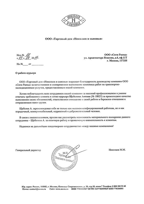 ООО "Торговый дом "Николаев и сыновья" выражает благодарность руководству компании ООО "Сити Рапид" за качественное и своевременное выполнение комплекса работ по транспортно-экспедиционным услугам, предоставляемым нашей компании.
