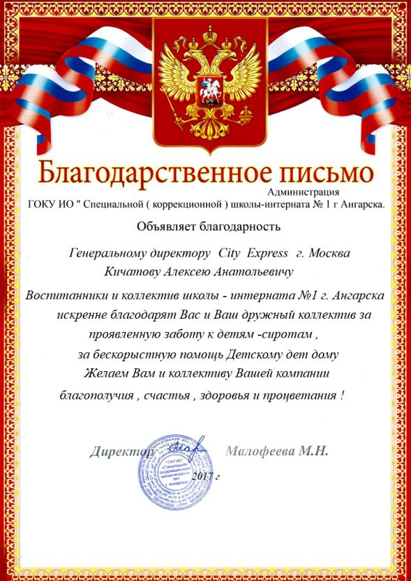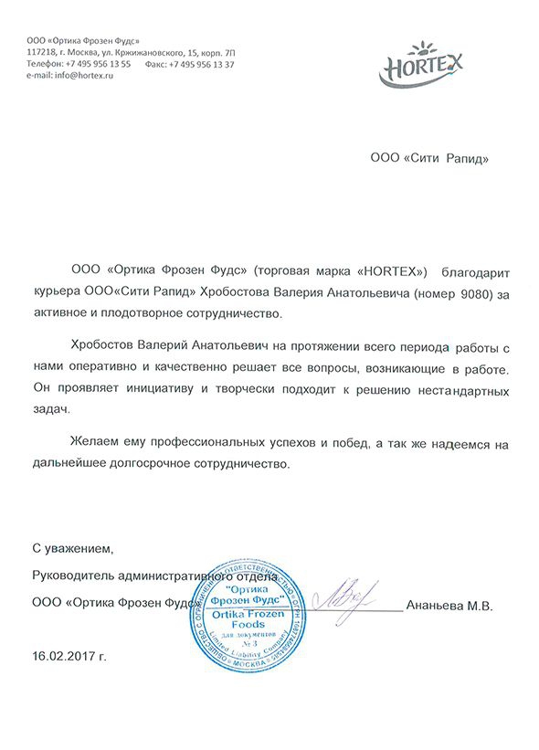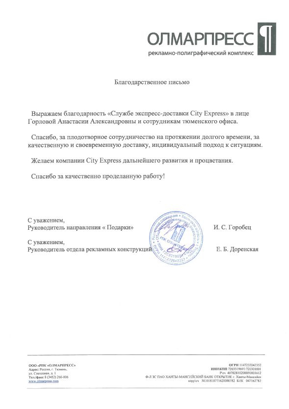 Благодарим компанию Сити Экспресс за плодотворное и беспроблемное сотрудничество уже на протяжении трех лет. Всегда получаем от менеджеров быструю обратную связь по всем вопросам относительно наших заказов. Отдельно хочется отметить высокое внимание ко всем пожеланиям со стороны клиента. Нам очень приятно видеть ответственных и добросовестных исполнителей.